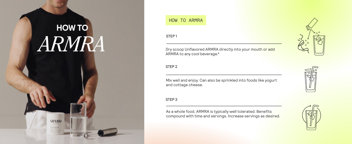 When you take ARMRA Colostrum™ you fuel your body with potent prebiotics that support your microbiome, a host of peptides and antibodies that strengthen your immune barriers, and dozens of antioxidants and bioactive molecules that optimize cellular pathways throughout your body - for synergistic revival of your whole body health.